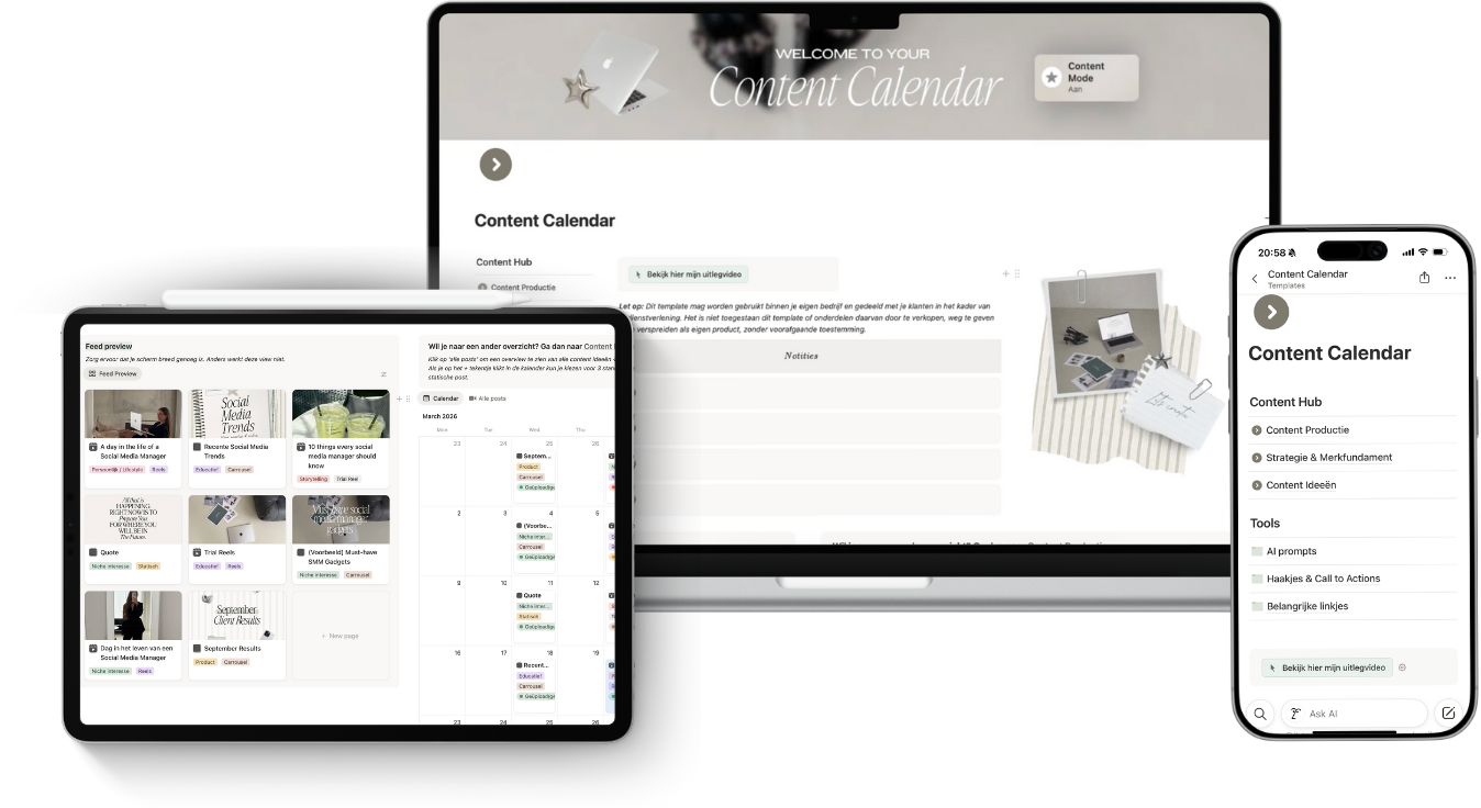Steel het template die ik voor mijn eigen content strategie gebruik én voor mijn klanten. Dit is ideaal als je een beter overzicht wilt, meer rust & consistent wilt gaan posten op Social Media.