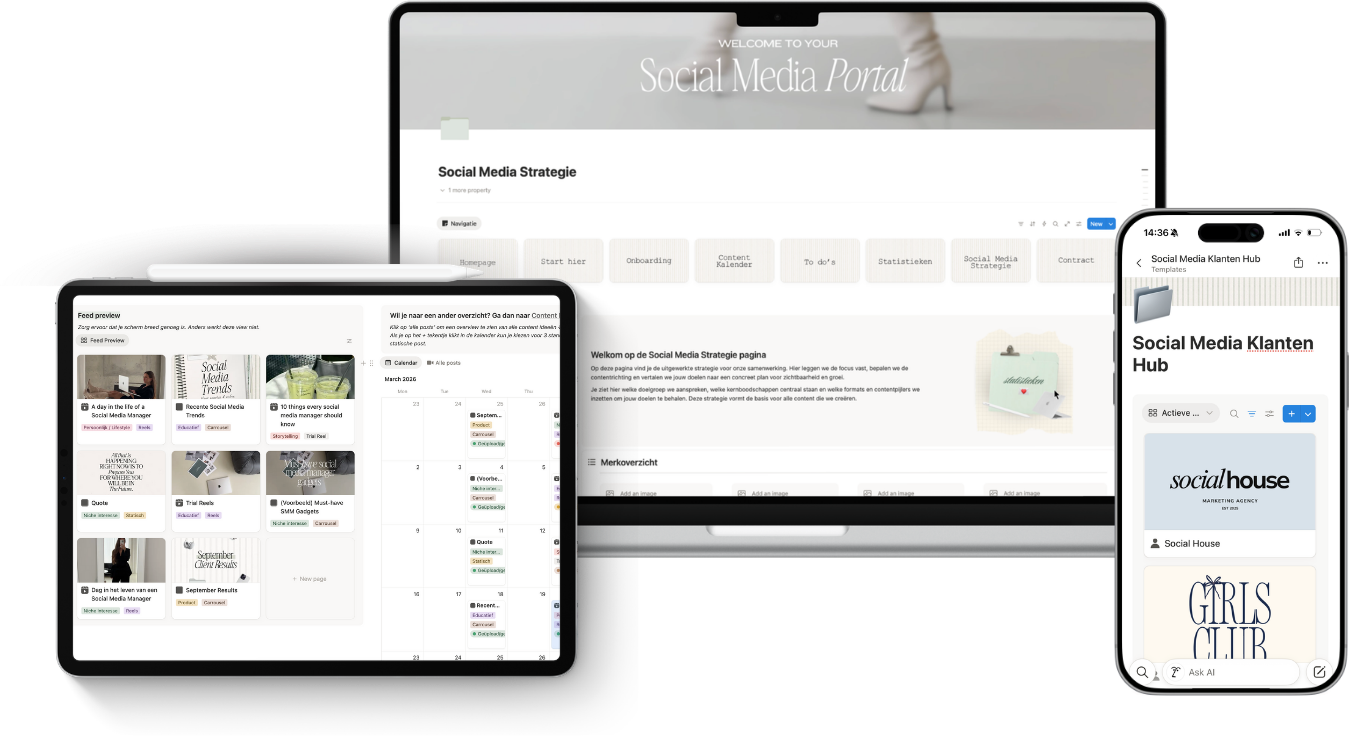 Een professioneel Notion client hub dashboard voor Social Media Managers. Beheer al je klanten vanuit één centrale omgeving, met overzicht per klant en ruimte om elk portaal volledig te customizen.