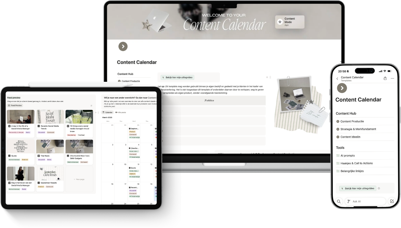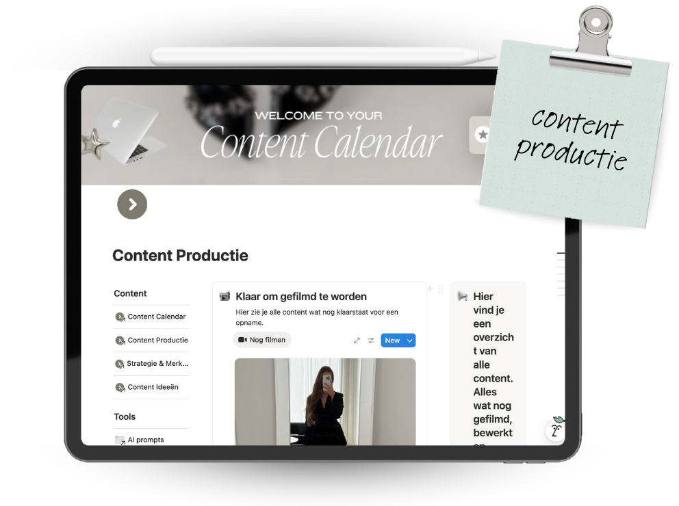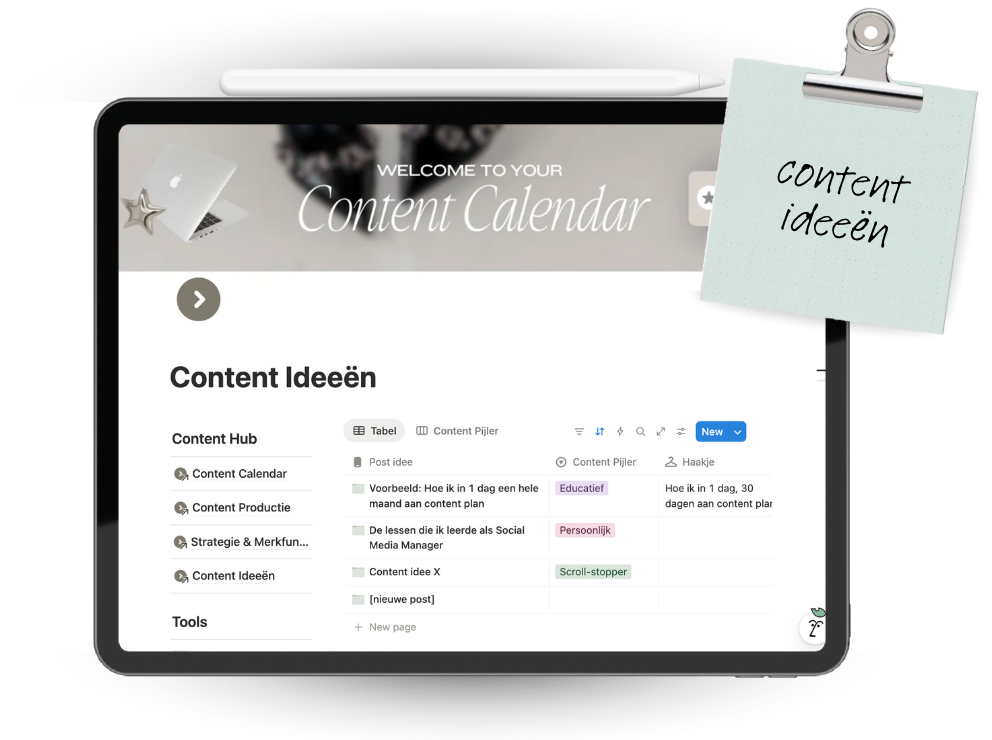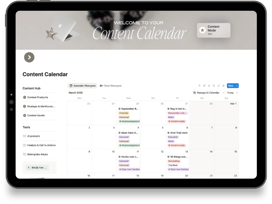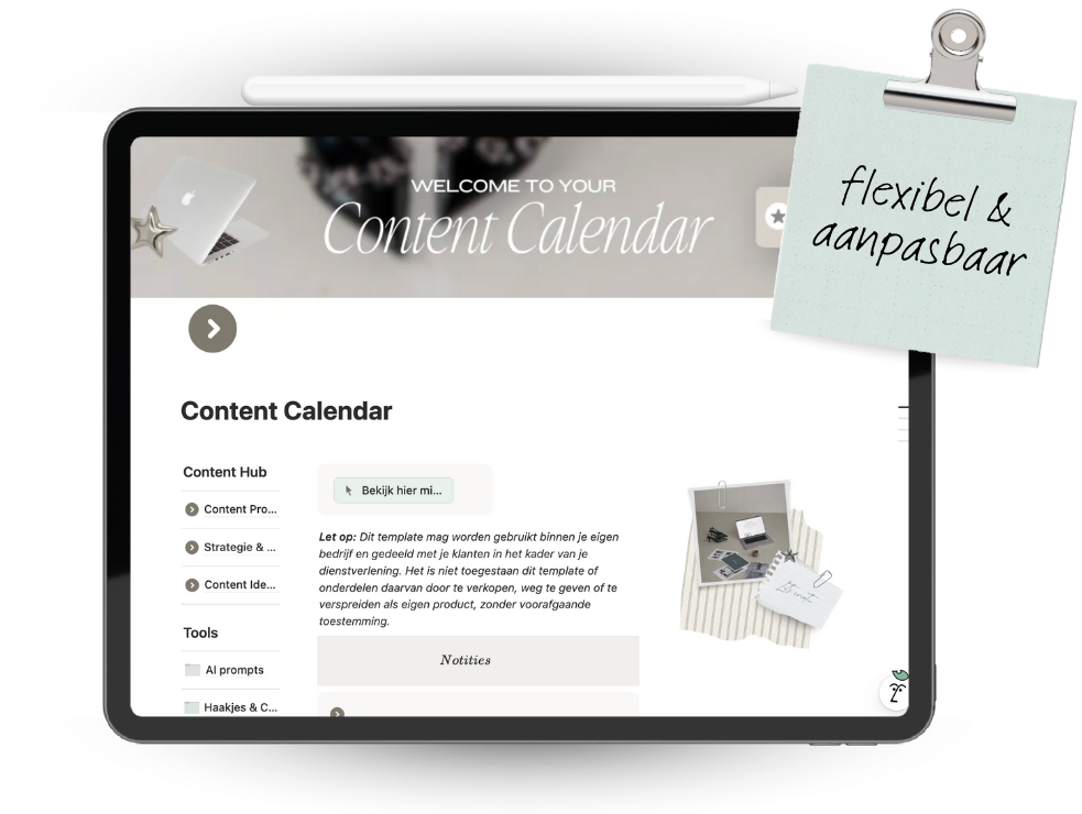 De Notion Content Kalender geeft je één plek voor al je ideeën, je planning en je strategie, zodat je elke week weet wat je post en waarom.
