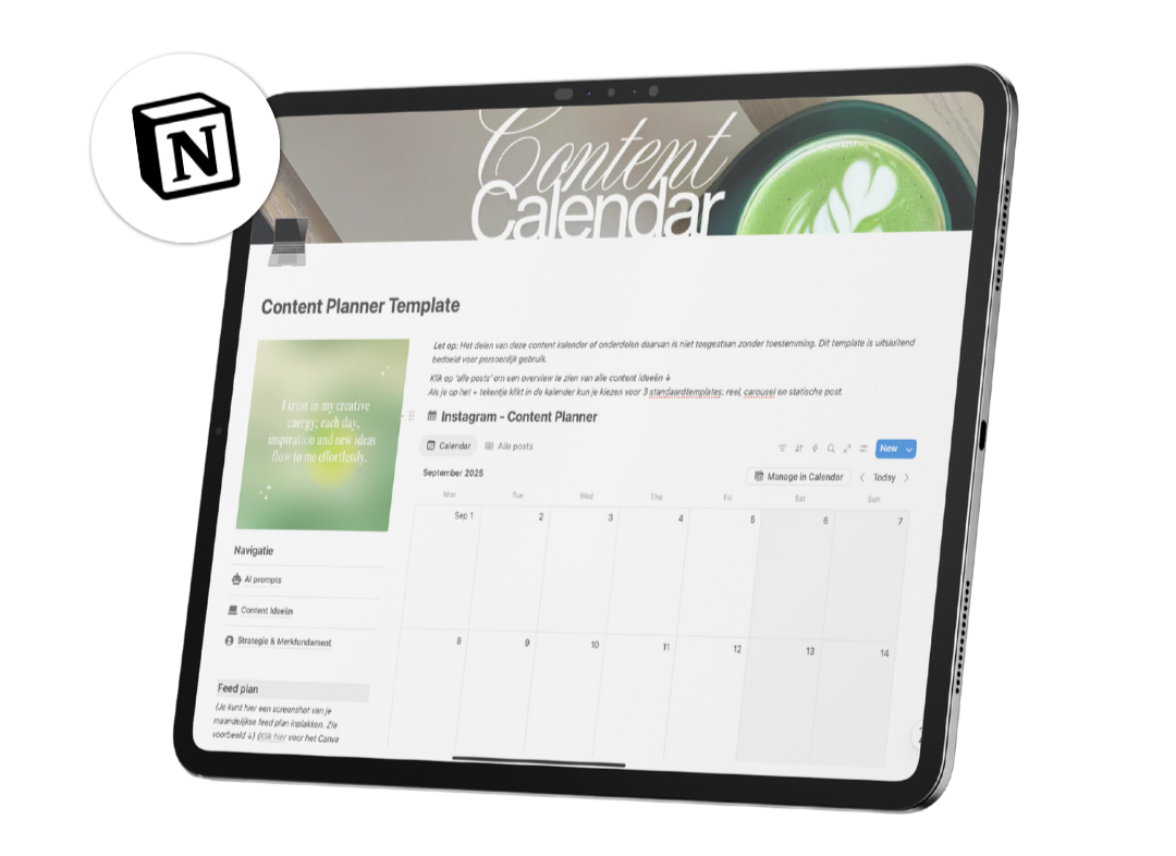 Een kant-en-klare contentkalender in Notion, inclusief AI prompts, contentformats, captioninspiratie, een visueel plansysteem en ruimte voor je eigen contentbank.